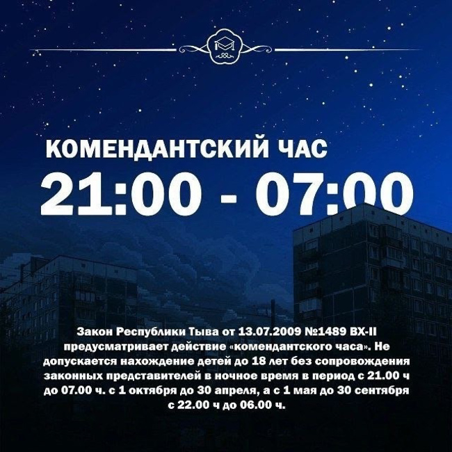 В Туве действует комендантский час для несовершеннолетних (закон Республики Тыва от 13.07.2009 №1489 ВХ-II ). Не допускается нахождение детей до 18 лет без сопровождения законных представителей в ночное врем ...